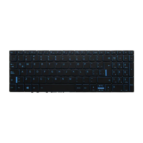 Teclado original para portátil Lenovo IdeaPad L340-15, incluyendo versiones L340-15IRH FG541 con procesador i7-9ª generación. Diseño con marco integrado, retroiluminación (backlight) en color azul, acabado negro elegante e idioma español (layout Latinoamérica). Ideal como repuesto OEM para restaurar la funcionalidad y estética original del equipo con calidad garantizada.